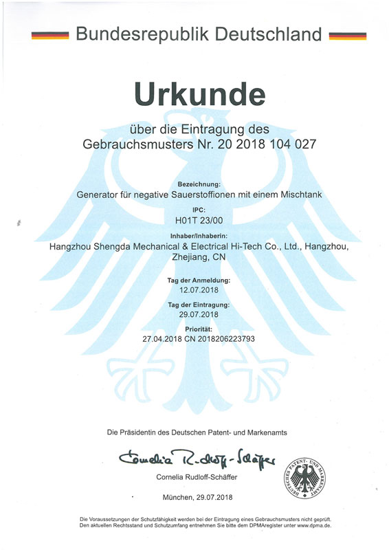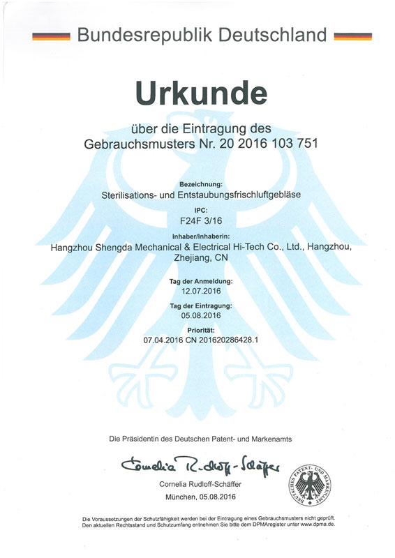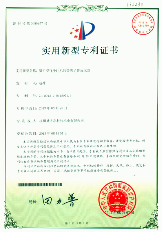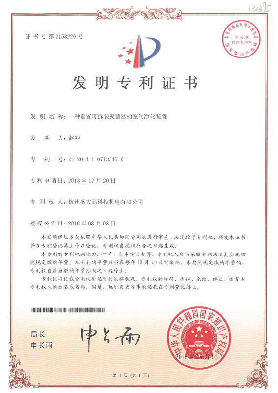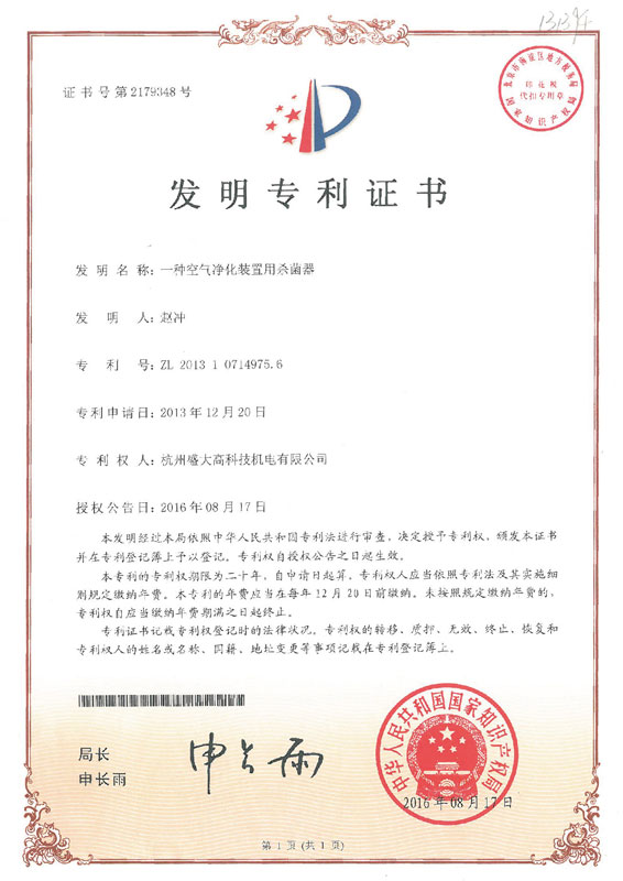 空气杀菌器专利证书
